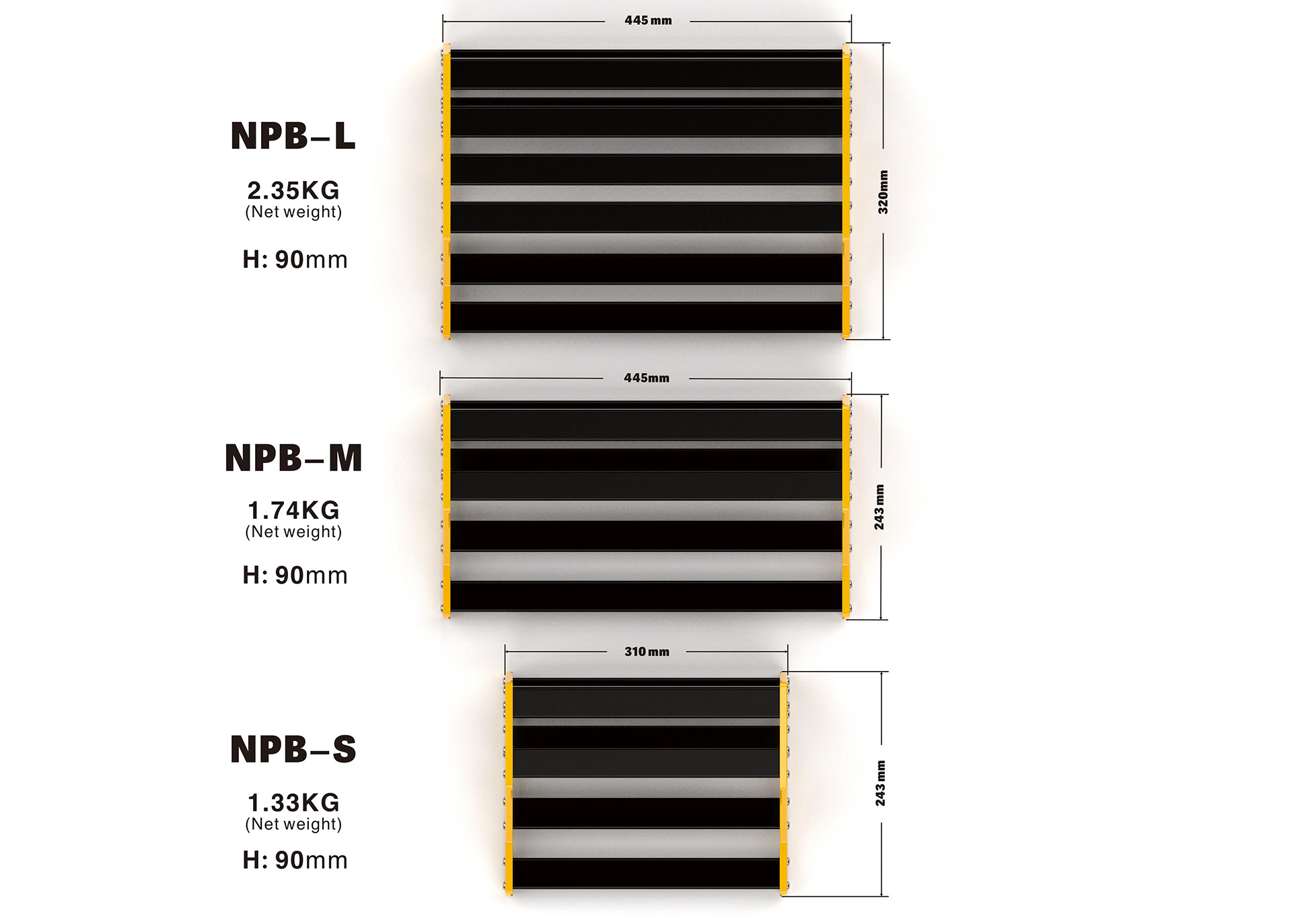 - Large (NPB‑L): Cocok untuk pengguna pedal berat, dimensi 320 x 445 x 90 mm, berat 2,3 kg.
